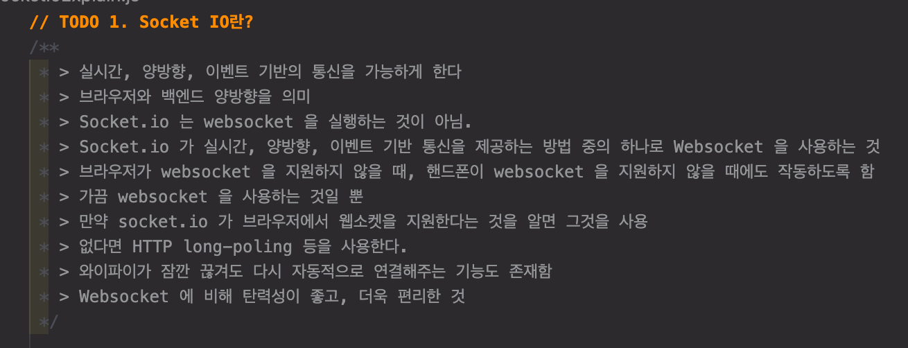 * > Socket.io 가 실시간, 양방향, 이벤트 기반 통신을 제공하는 방법 중의 하나로 Websocket 을 사용하는 것
