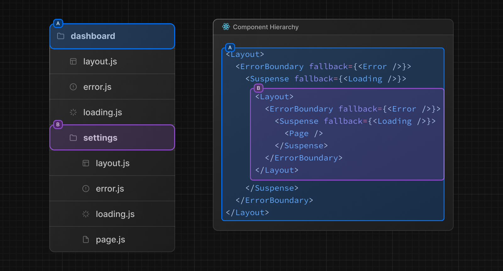 중첩 경로(Nested Routes) 를 생성하는 방법은 각각의 폴더 안에서 중첩된 폴더를 만드는 것이다. 예를 들어 /dashboard/settings 라는 Route(경로)를 만들고 싶다면 app 디렉토리 내에서 두 개의 폴더를 만들면 된다.