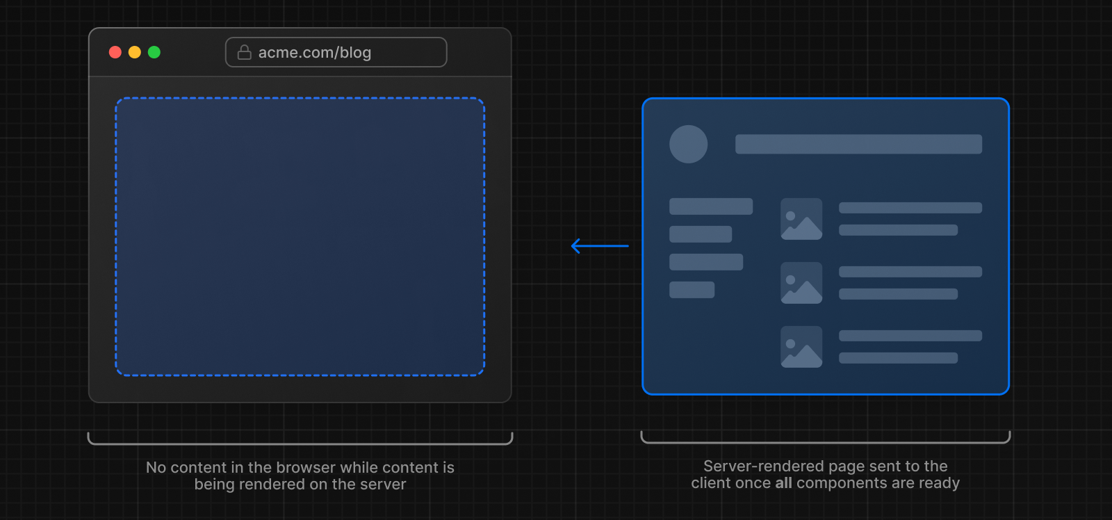이런 단계는 순차적이면서 블로킹된다. 다시 말해, 서버는 페이지의 HTML 을 렌더링할 때 모든 데이터를 다 가져올 때까지 기다려야 한다. 그리고 클라이언트에서는 페이지의 모든 컴포넌트 코드가 다운로드될 때까지 UI 를 **hydrate** 할 수 없다.