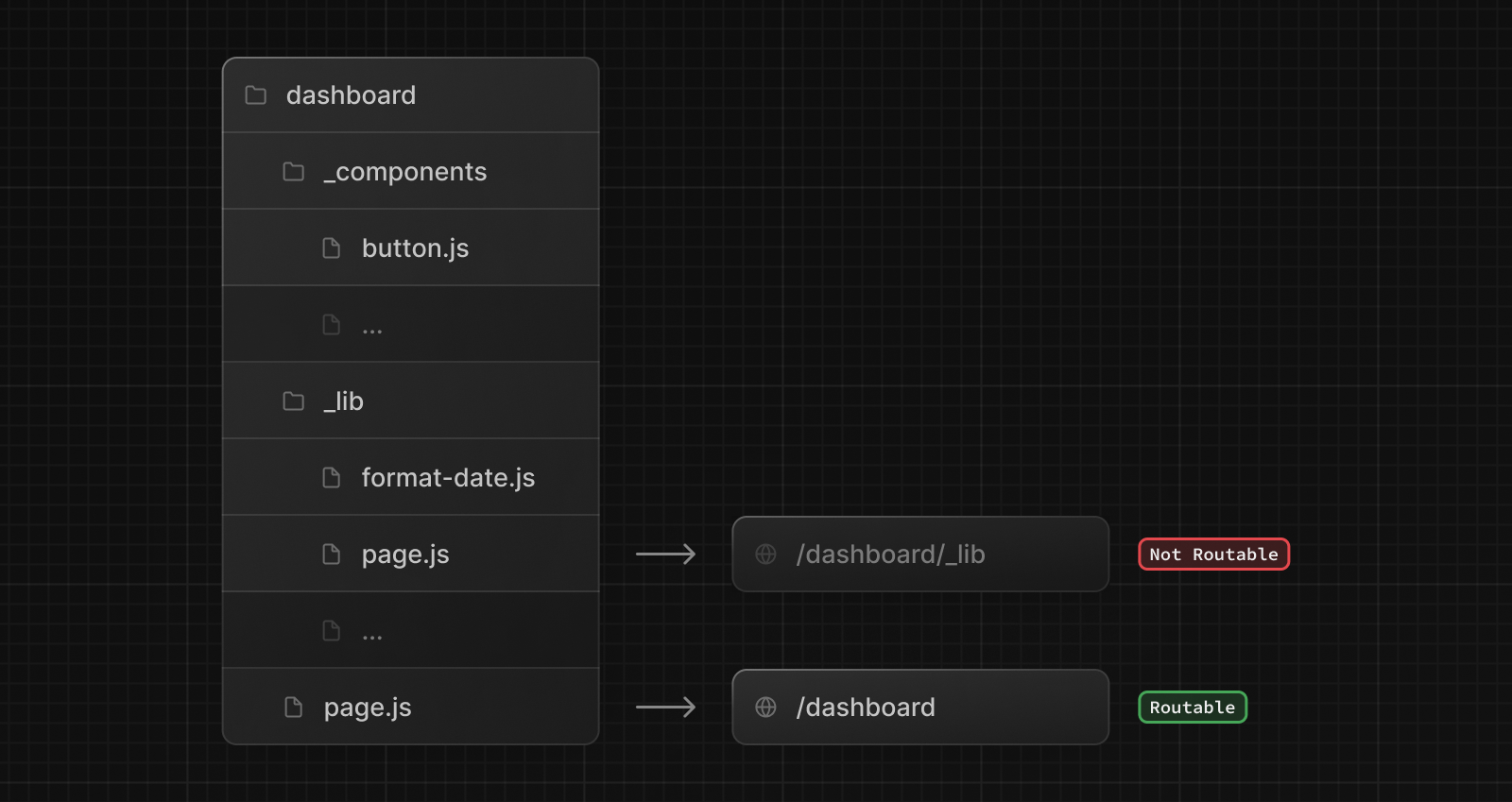 이것이 의미하는 바는, app 디렉토리 내부에서 파일들을 개발자 임의로 생성더라도 실수로 그것이 화면에 보여질리가 없다는 것이다.